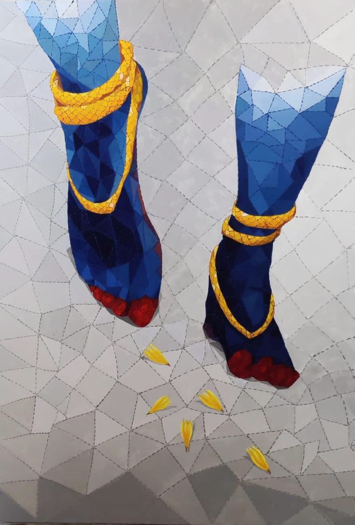 The colour scheme is a blend of deep blues and golds, creating a striking visual contrast. The shades of blue, associated with Krishna, symbolise depth, wisdom, and the infinite cosmos, reinforcing his divine nature. The golden hues of the anklets and petals introduce an element of warmth and prosperity, accentuating the sacred aura of the composition. The subtle gray and white tones in the background offer a sense of neutrality and elevation, allowing the focus to remain on the divine feet.