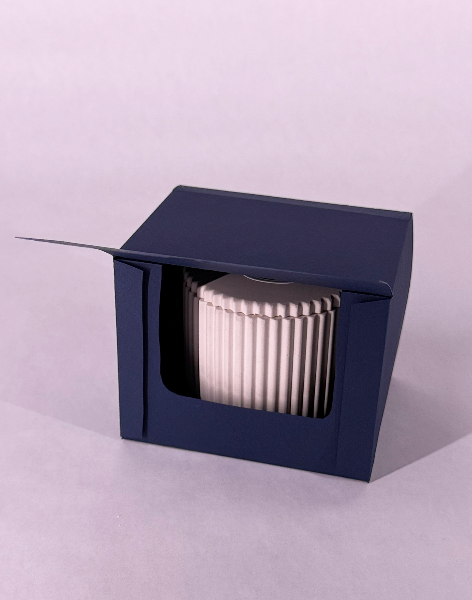 Encased in a deep charcoal and navy box with gold detailing, the packaging reflects the collection’s timeless sophistication and organic elegance. The dark tones contrast beautifully with the soft porcelain jar, reinforcing the balance between nature and luxury.