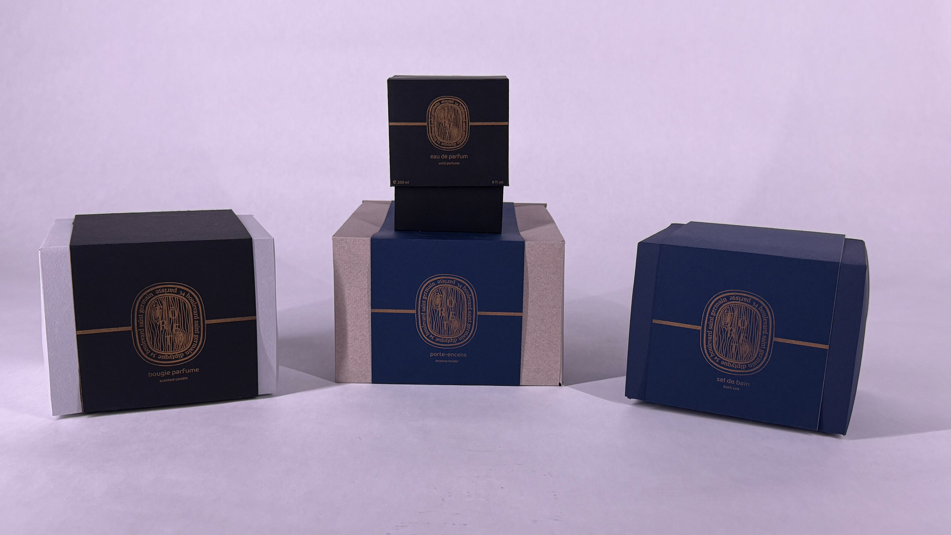The Forêt diffuser collection blends organic forms with Diptyque’s refined aesthetic, creating functional incense and fragrance pieces. These concept sketches explore unique silhouettes, including a lotus-inspired incense holder, woven-texture reed diffuser, and fluid fragrance dispensers, all unified by a cohesive branding approach. Crafted from ceramic, glass, and wood, the designs reflect the forest-inspired warmth of mahogany and teakwood.