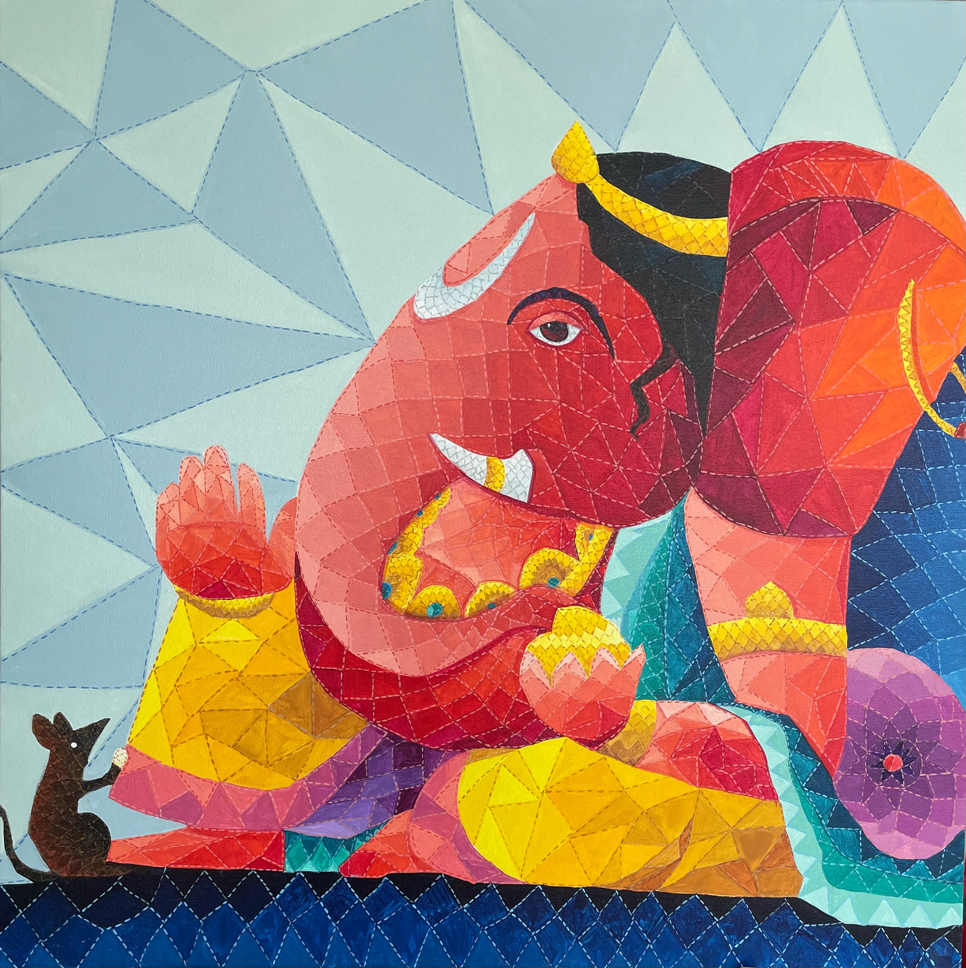 Eternity captures the timeless essence of Lord Ganesha, a deity whose presence transcends eras, symbolizing wisdom, prosperity, and the infinite cycle of creation and renewal. The painting’s polygonal composition with intricate stitch like detailing mirrors the craftsmanship of Indian handloom textiles, reinforcing the idea of continuity and interconnectedness, threads woven through time just as Ganesha’s presence is eternally woven into cultural and spiritual consciousness.