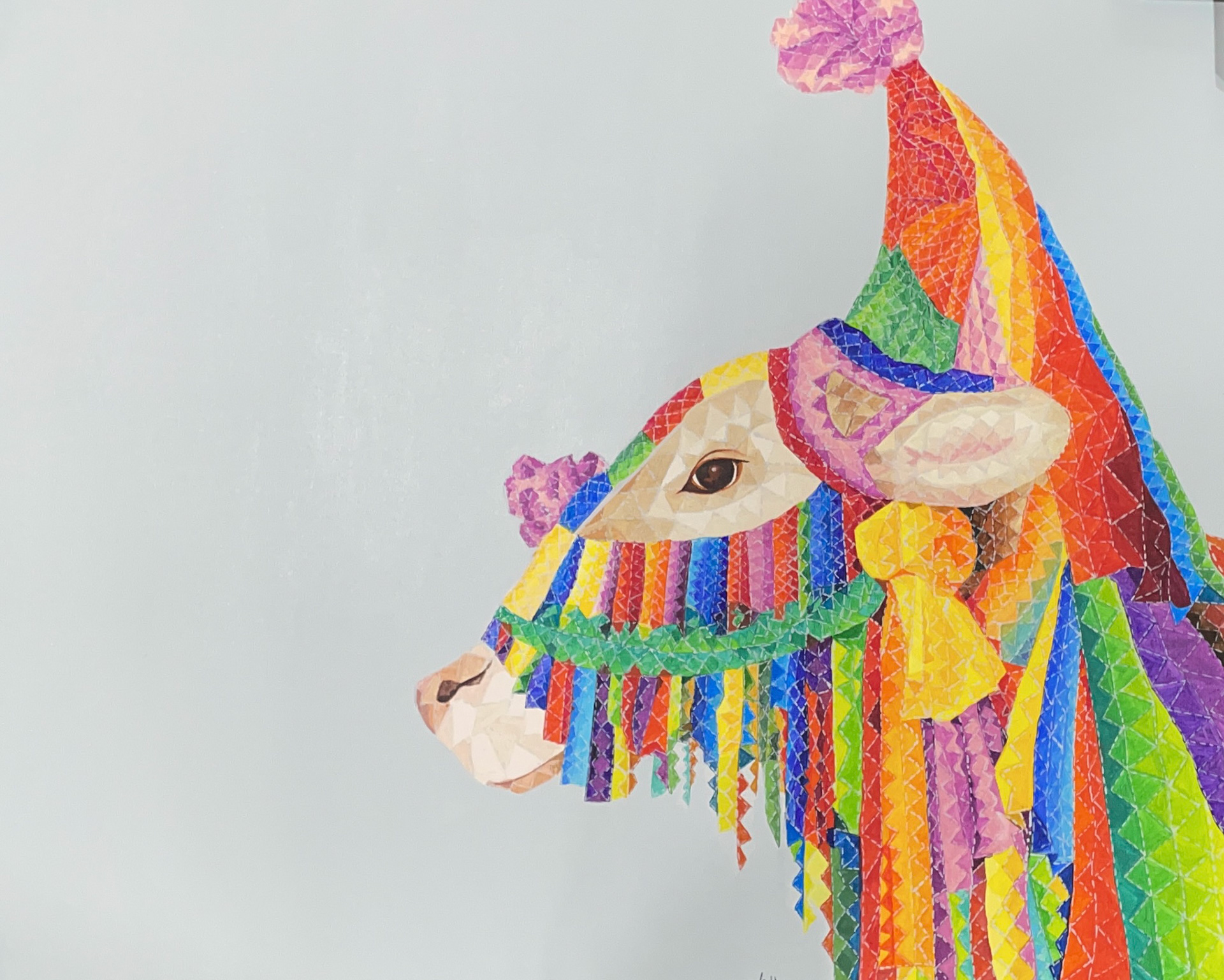 The colour scheme bursts with vibrancy, celebrating the divine essence of Kamdhenu. A spectrum of rainbow hues dominates the composition, emphasising joy, vitality, and auspiciousness. The use of rich reds, deep blues, and bright yellows adds a sense of regality, while greens and purples weave through the piece, reinforcing harmony and divinity. The contrast between the cow's serene gaze and the dynamic movement of the colors creates a captivating balance, drawing attention to both the subject’s grace and the exuberance of its adornment. The soft neutral background allows the colors to take center stage, enhancing the visual impact of the composition.