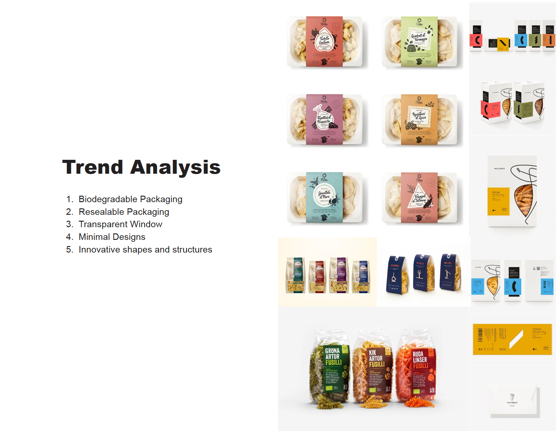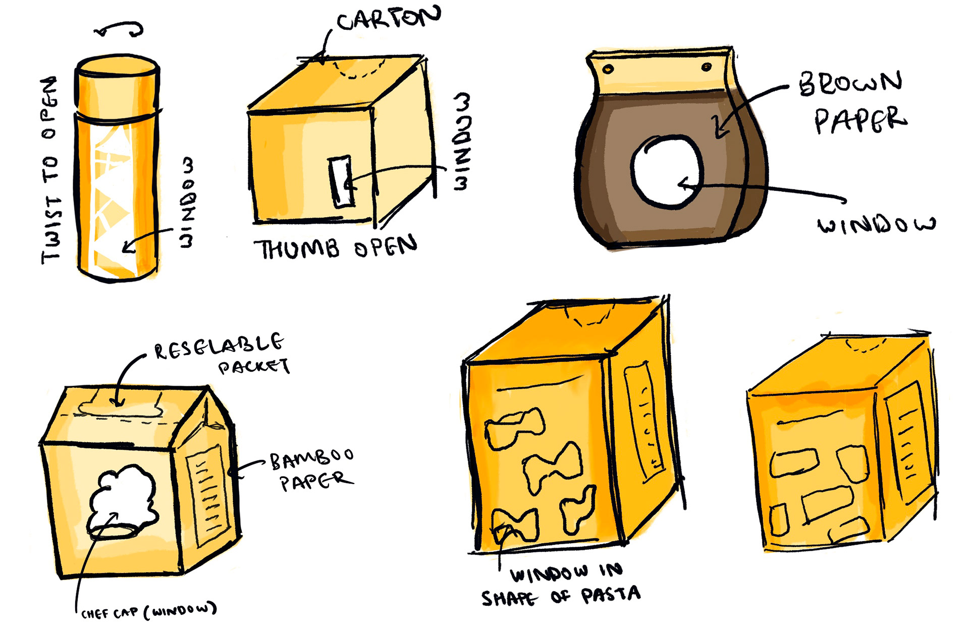 The Pastalina packaging was designed to be playful and functional, with early sketches exploring unique box structures and pasta-shaped windows. The final chef’s hat window creatively showcases the pasta while reinforcing the brand’s artisanal feel.